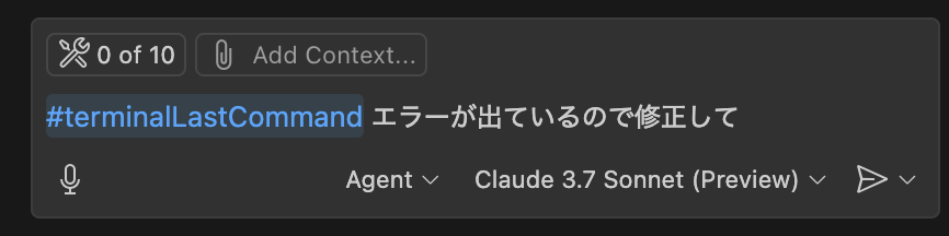 例えば、ビルド時やテスト実行時にエラーが出た際に、以下のように入力するとターミナルのエラー内容を確認してファイルを修正してくれます。